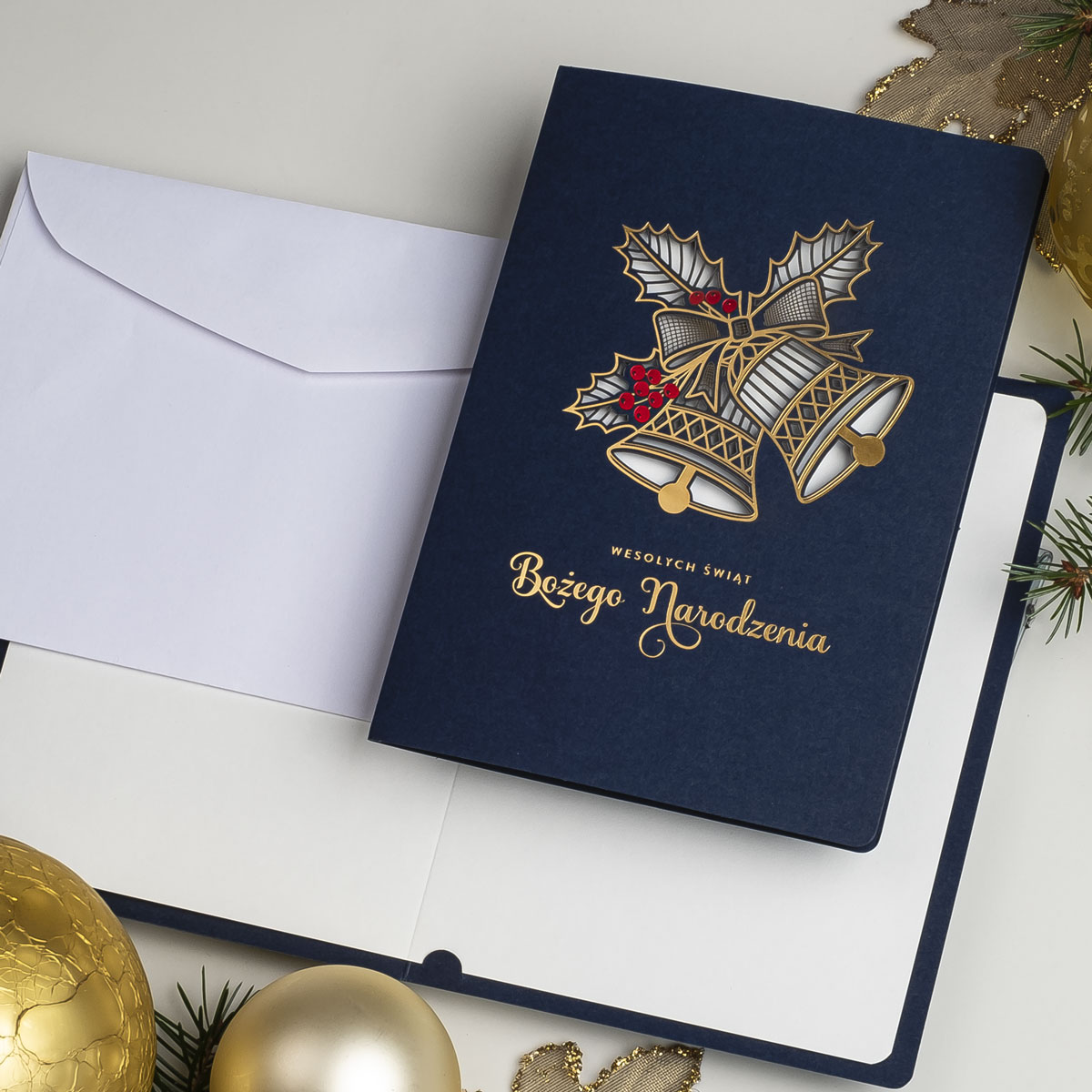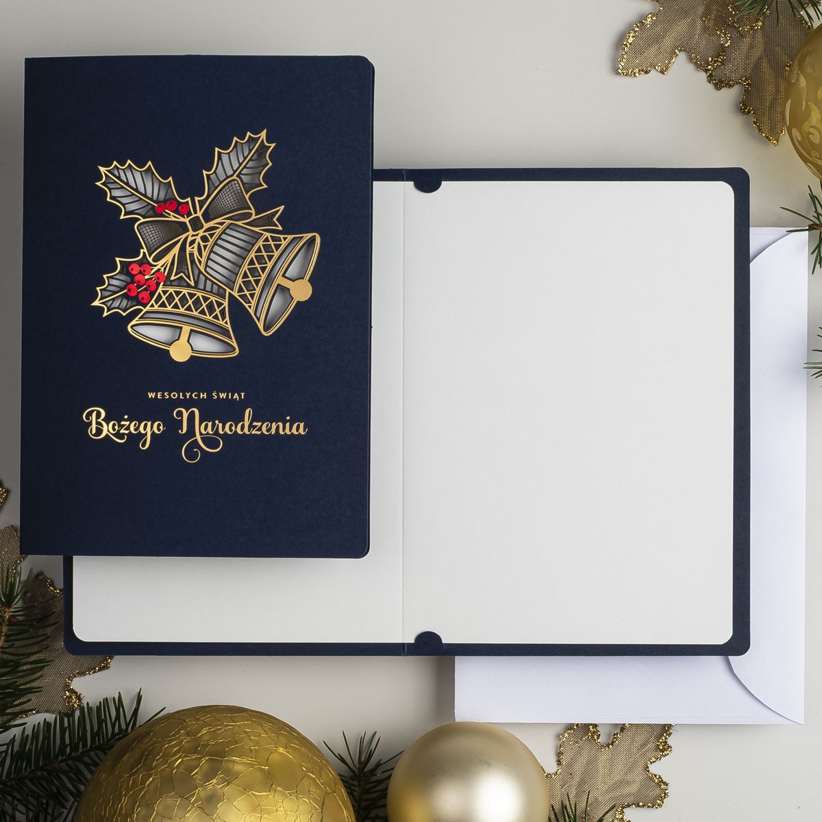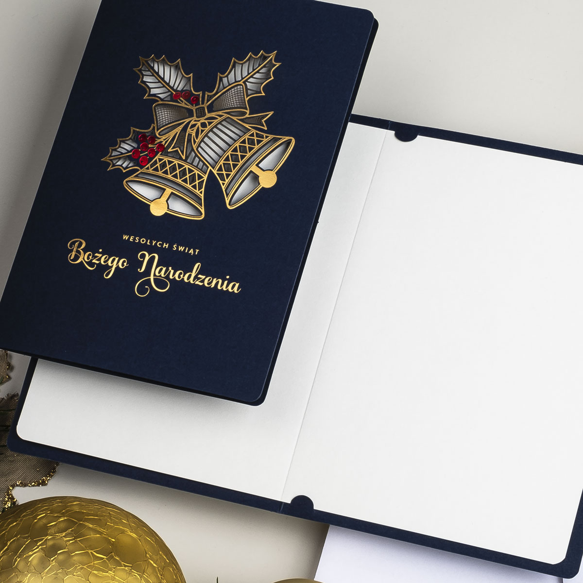 • Nadruk: możliwość zamówienia nadruku cyfrowego życzeń i logo (CMYK 4+0) na wkładce znajdującej się w środku kartki oraz złoconego, tłoczonego lub wycinanego logo na okładce