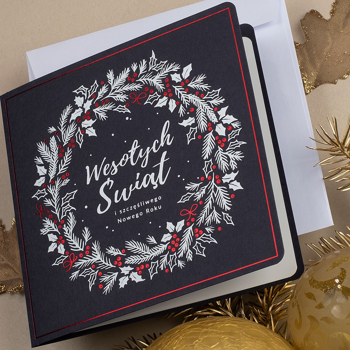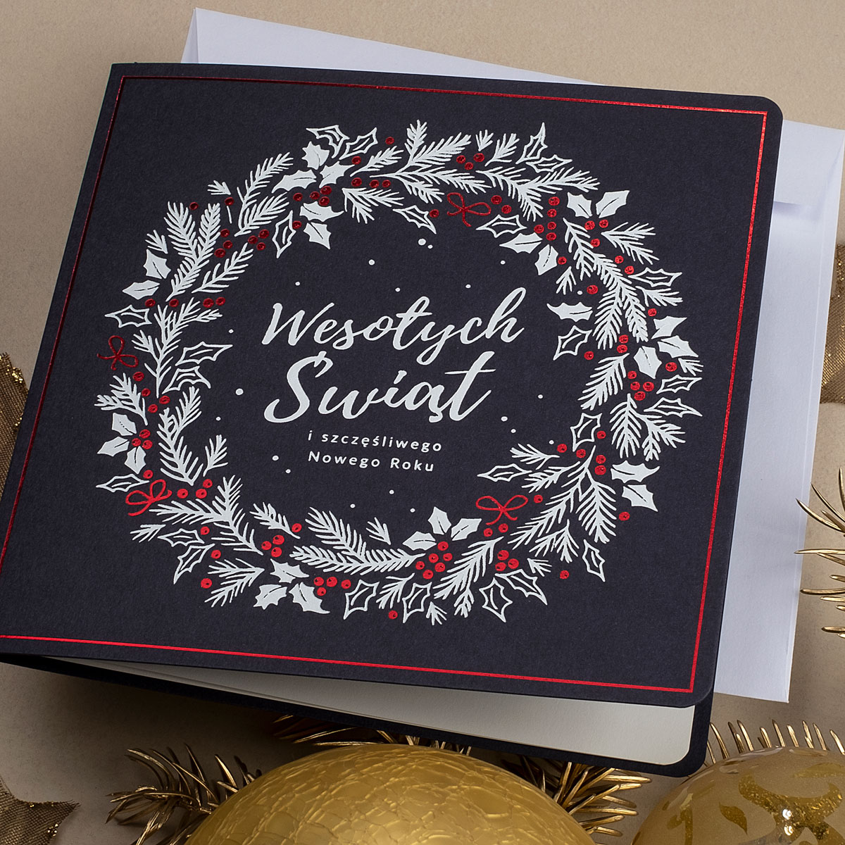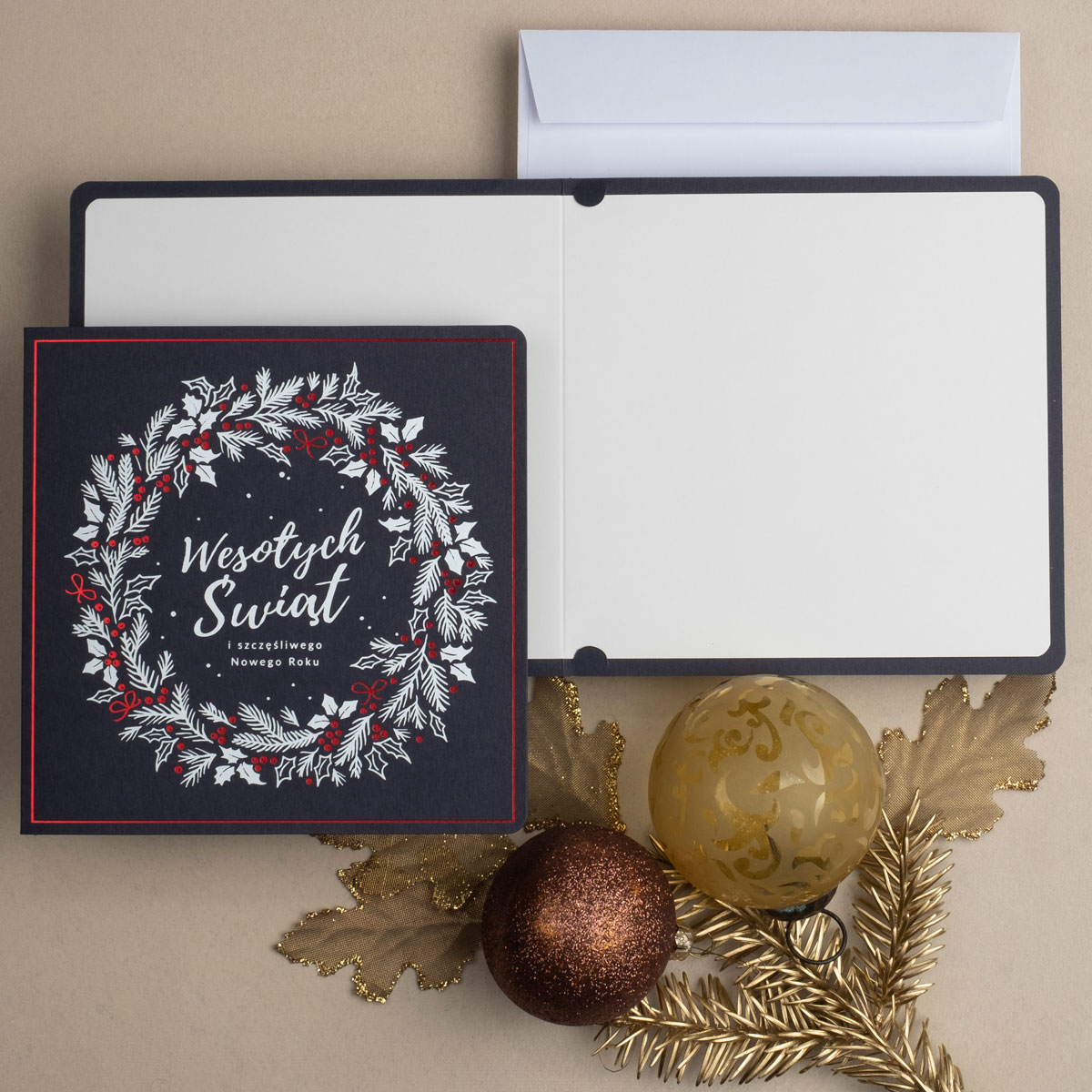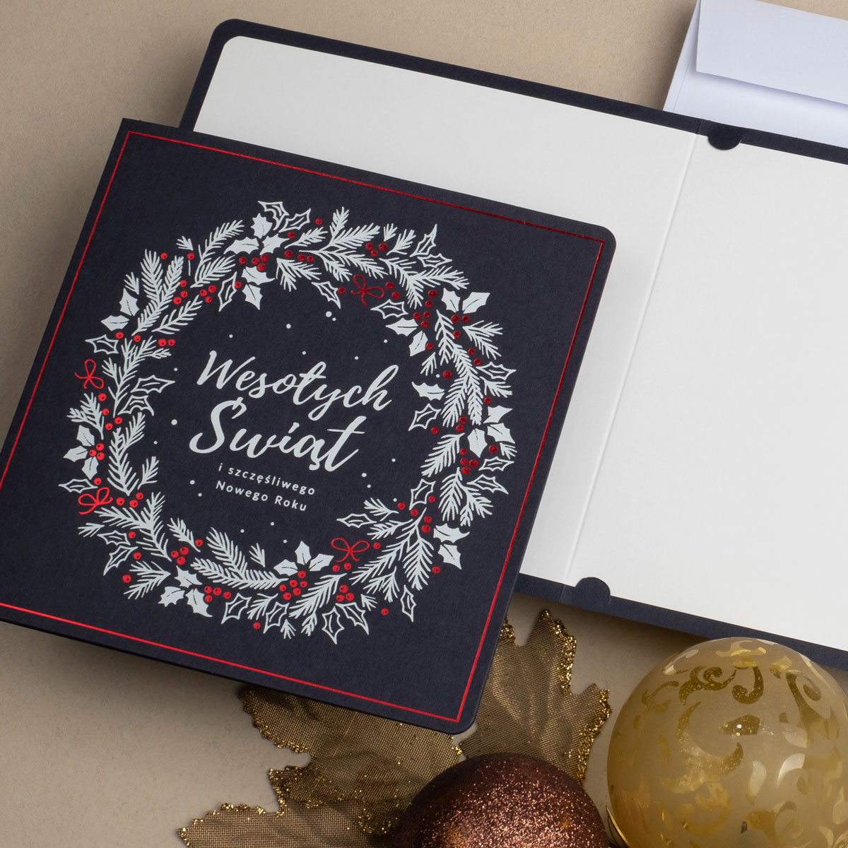 • Nadruk: możliwość zamówienia nadruku cyfrowego życzeń i logo (CMYK 4+0) na wkładce znajdującej się w środku kartki oraz złoconego, tłoczonego lub wycinanego logo na okładce