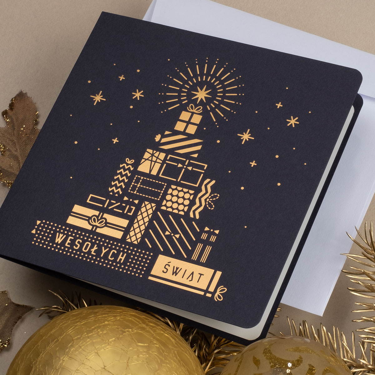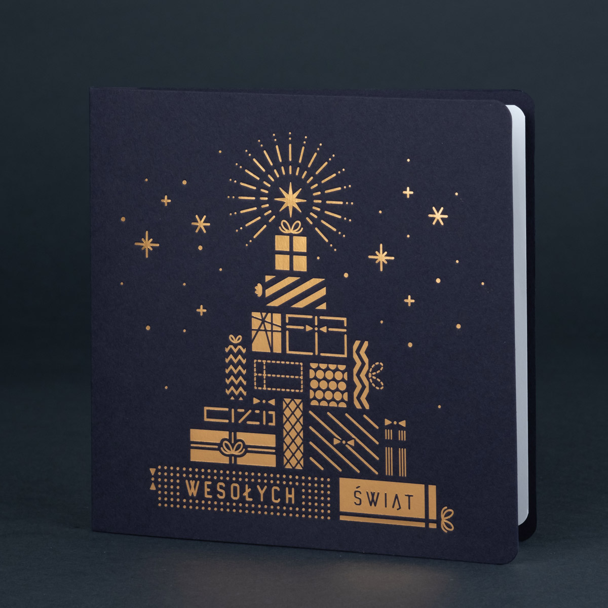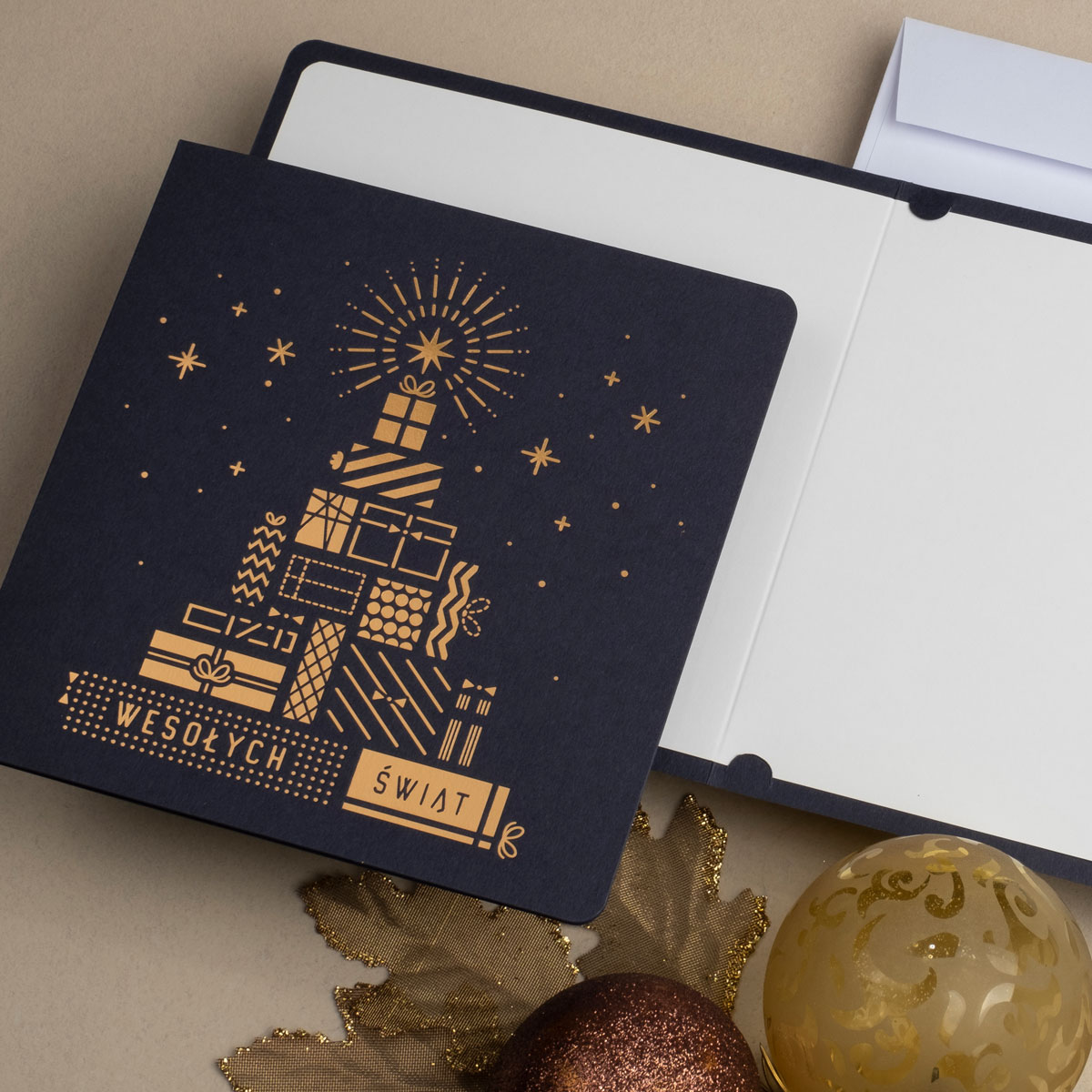 • Nadruk: możliwość zamówienia nadruku cyfrowego życzeń i logo (CMYK 4+0) na wkładce znajdującej się w środku kartki oraz złoconego, tłoczonego lub wycinanego logo na okładce