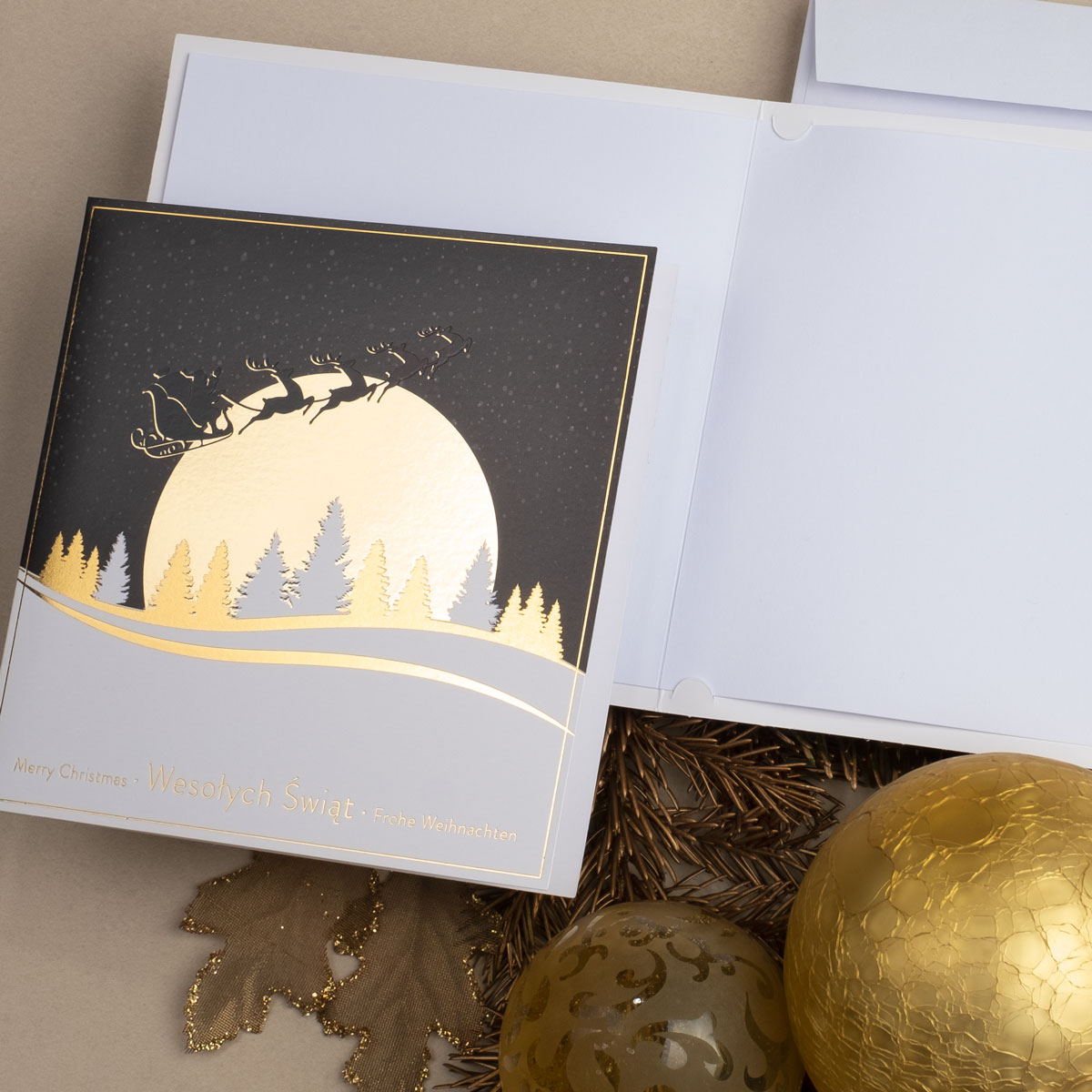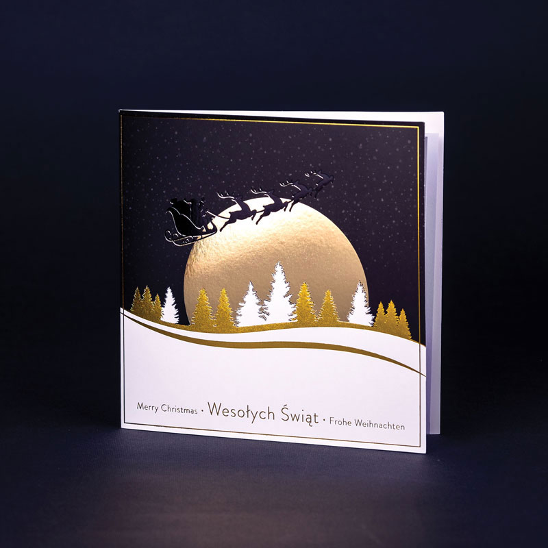 • Nadruk: możliwość zamówienia nadruku cyfrowego życzeń i logo (CMYK 4+0) na wkładce znajdującej się w środku kartki oraz złoconego, tłoczonego lub wycinanego logo na okładce