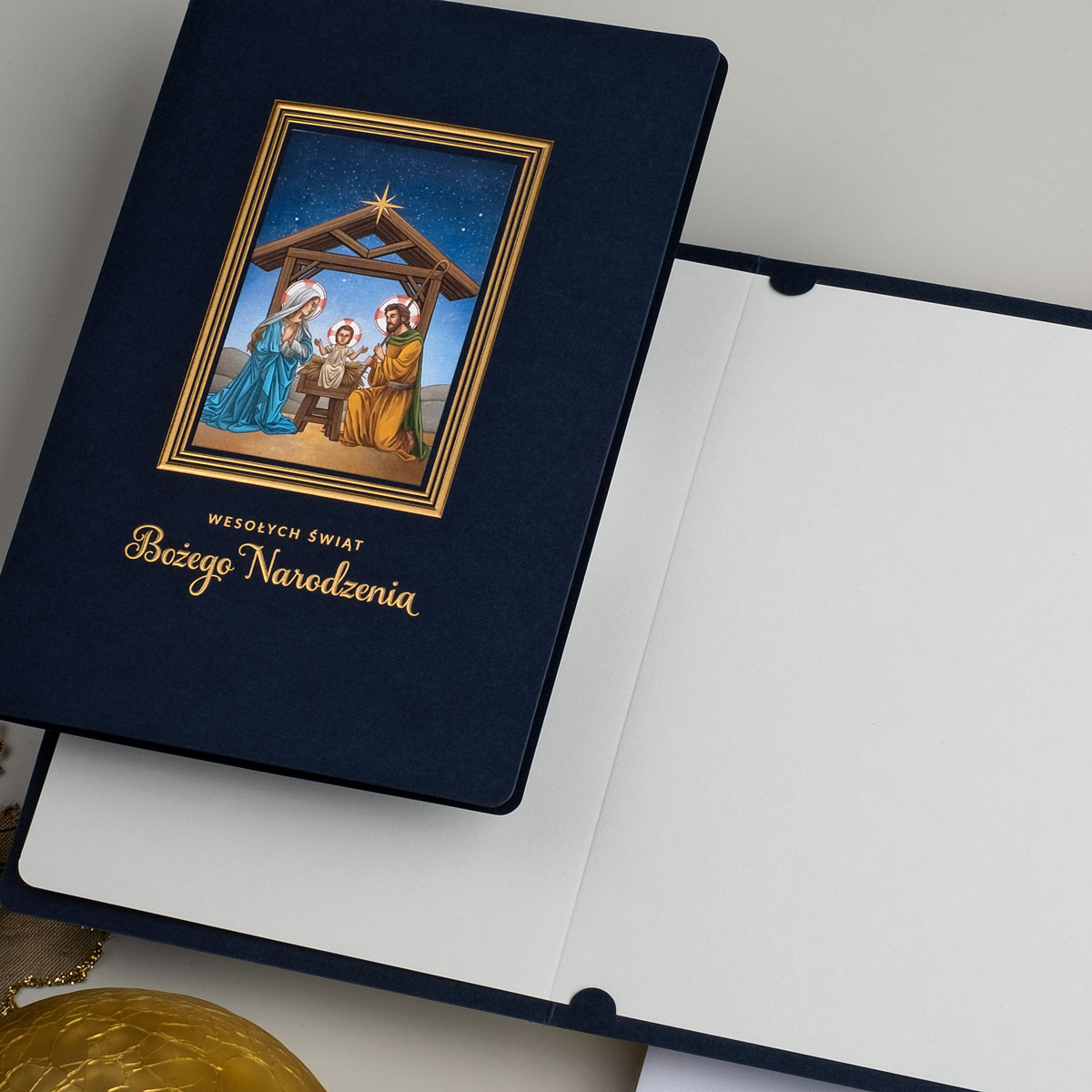 • Nadruk: możliwość zamówienia nadruku cyfrowego życzeń i logo (CMYK 4+0) na wkładce znajdującej się w środku kartki oraz złoconego, tłoczonego lub wycinanego logo na okładce