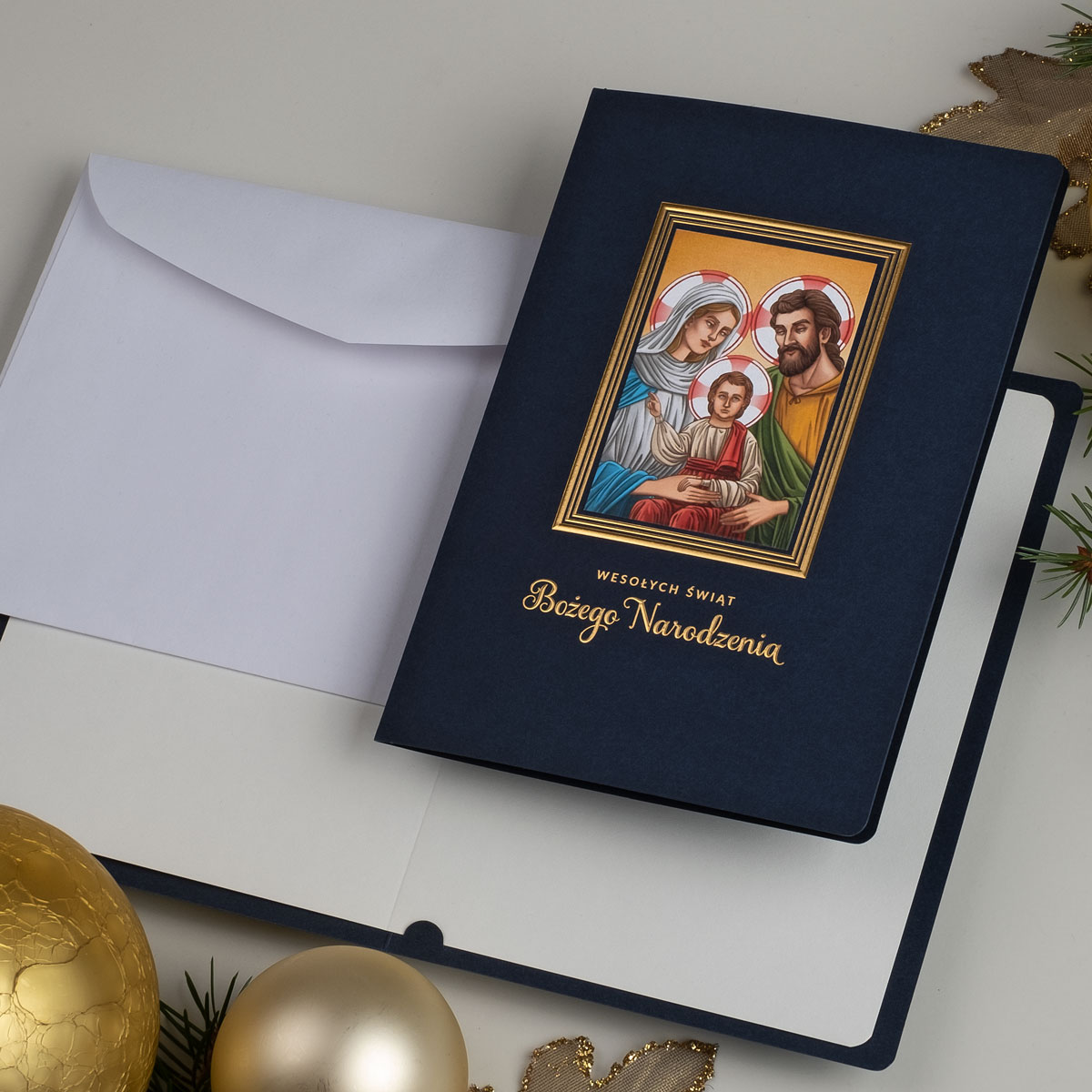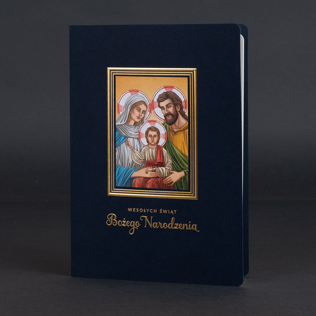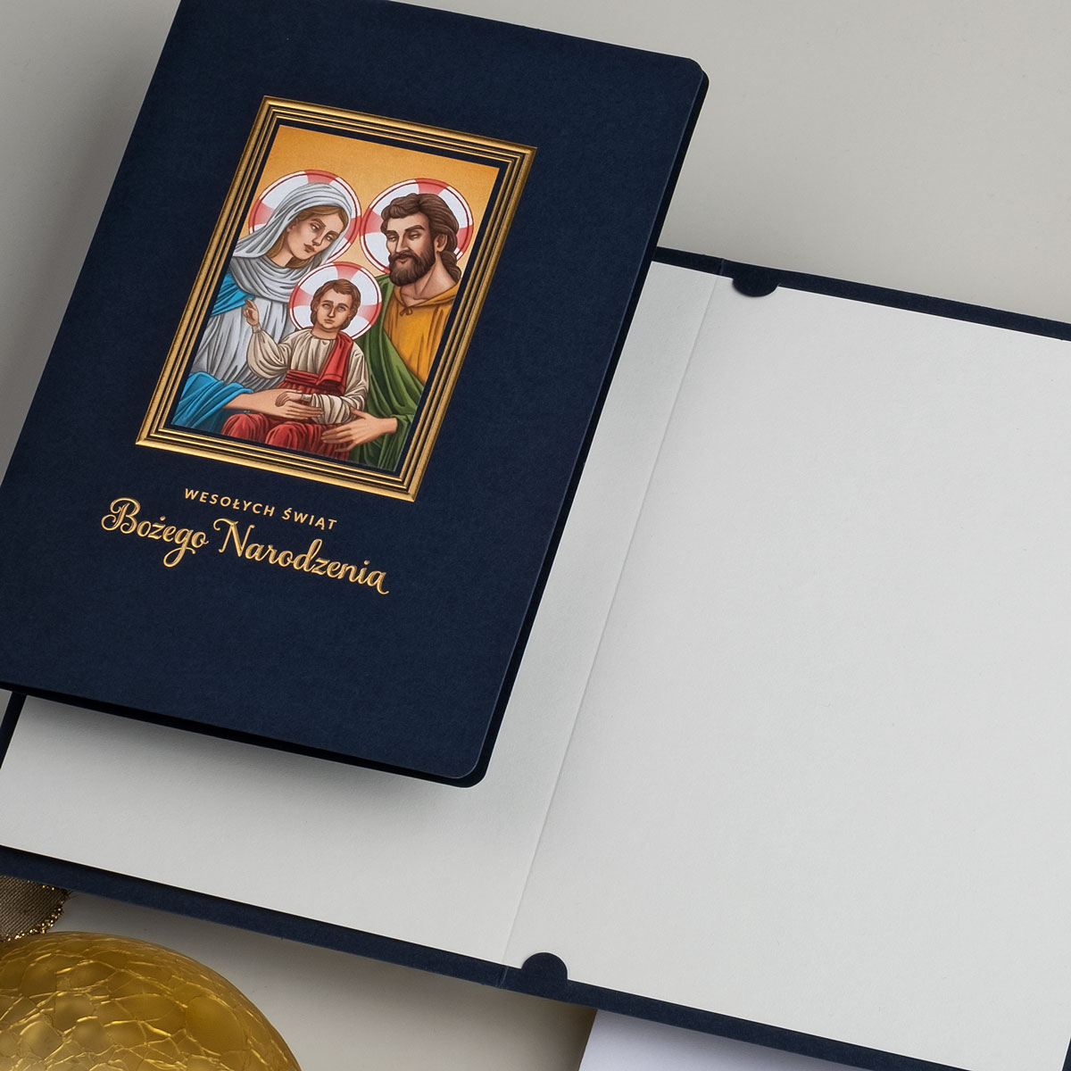 • Nadruk: możliwość zamówienia nadruku cyfrowego życzeń i logo (CMYK 4+0) na wkładce znajdującej się w środku kartki oraz złoconego, tłoczonego lub wycinanego logo na okładce