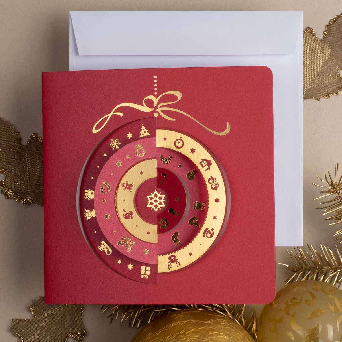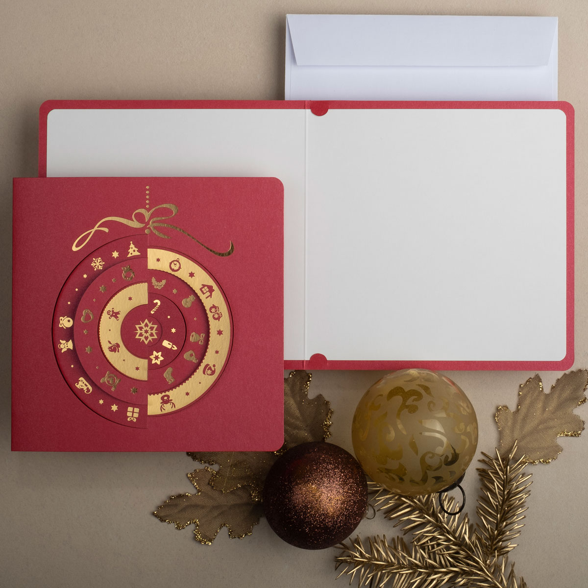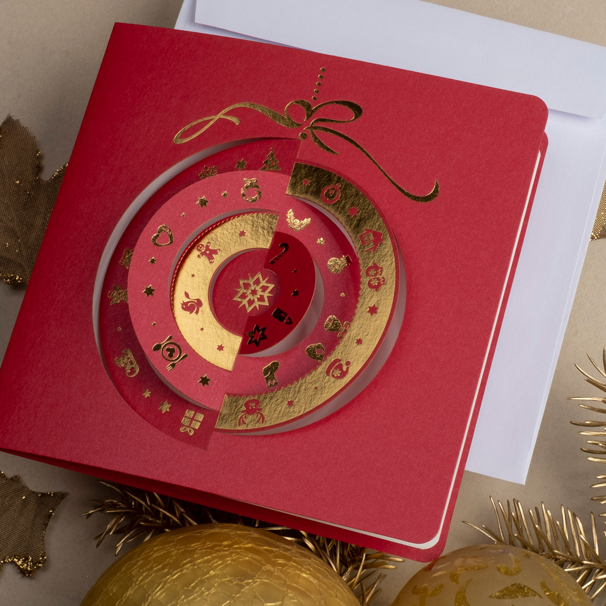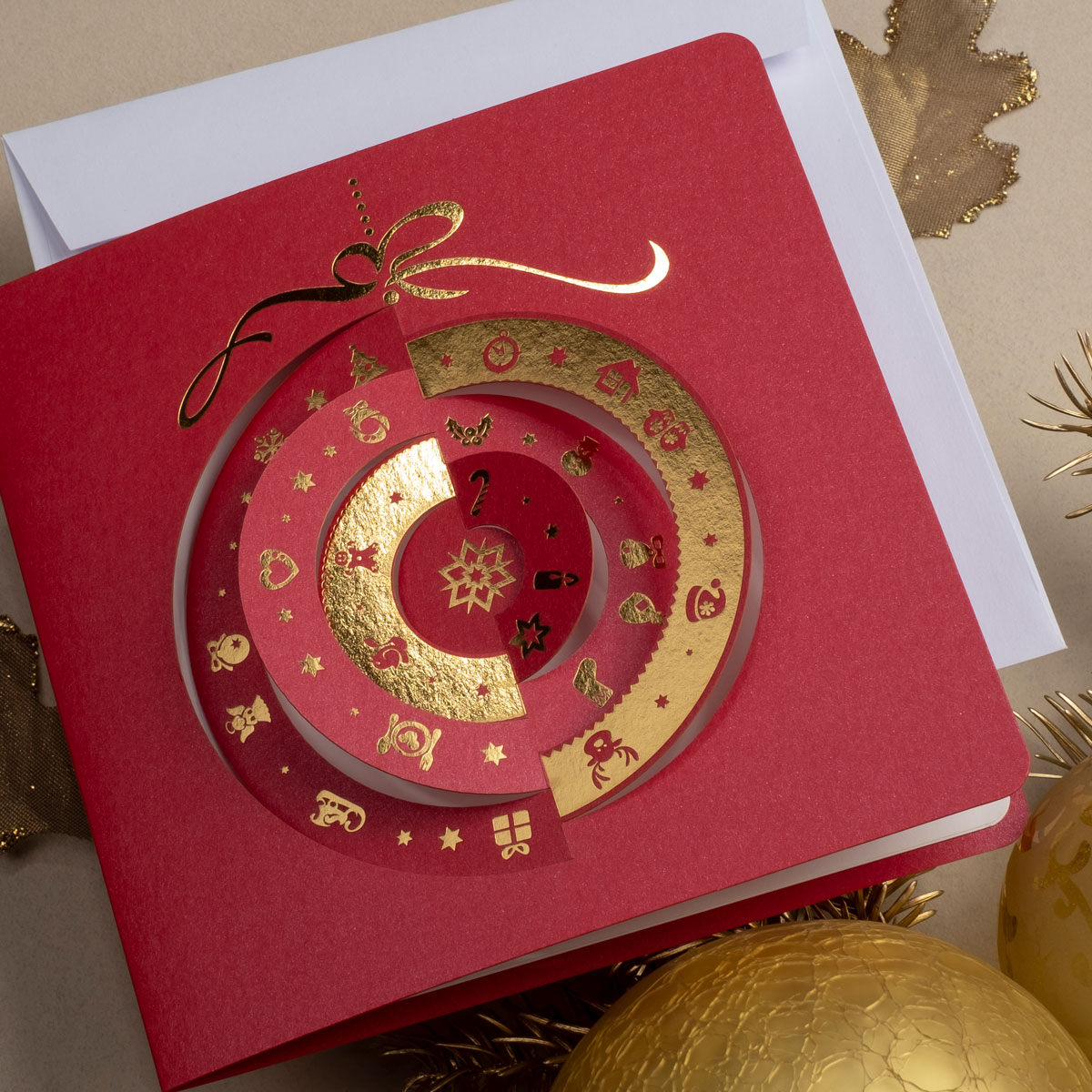 • Papier: Papier: czerwony ozdobny metalizowany 250 g/m² lub czerwony ozdobny matowy 300 g/m². Zdjęcia mogą odbiegać od ostatecznego wyglądu kartki, w zależności od rodzaju użytego papieru