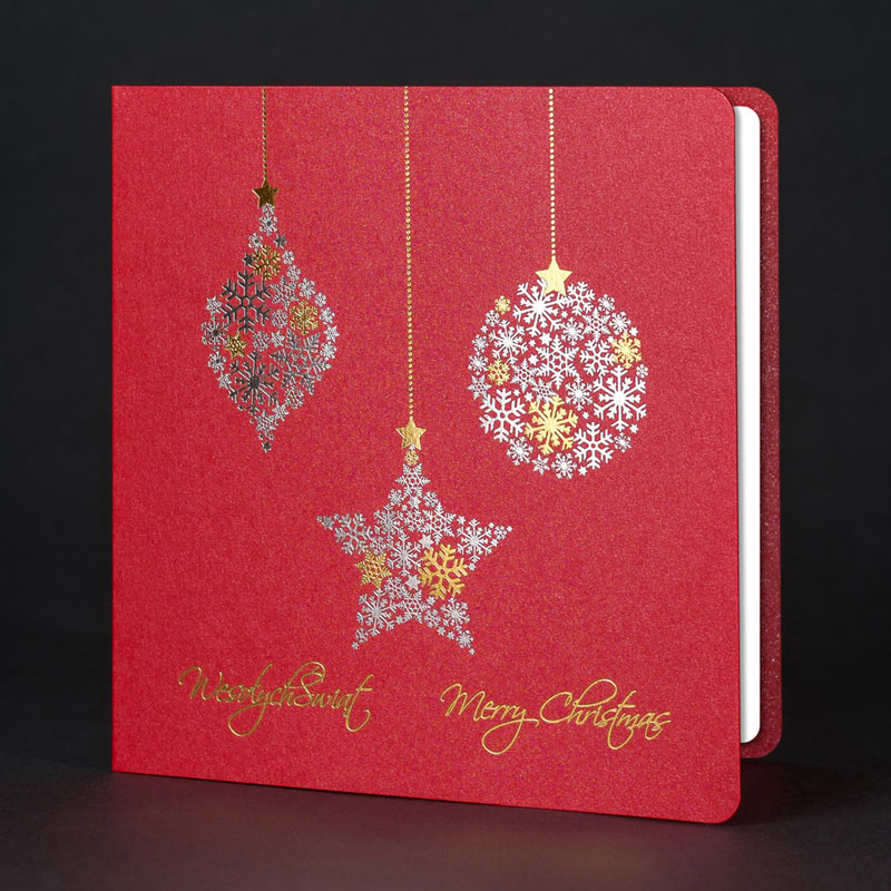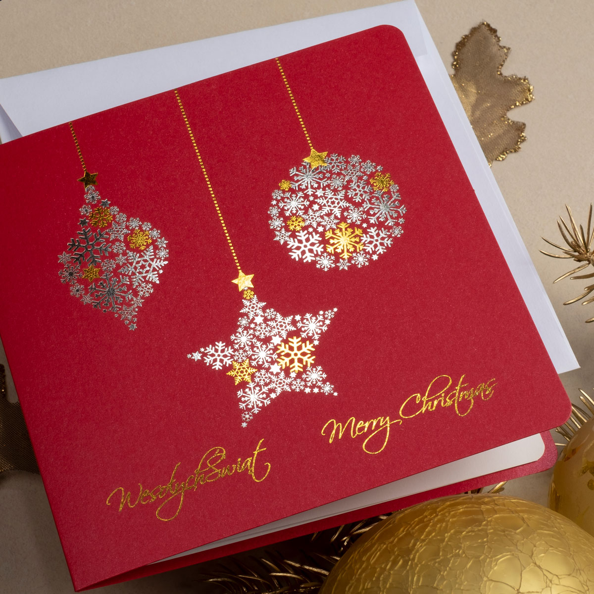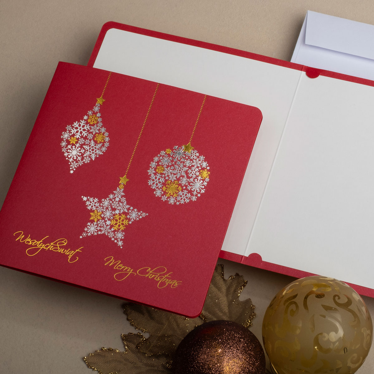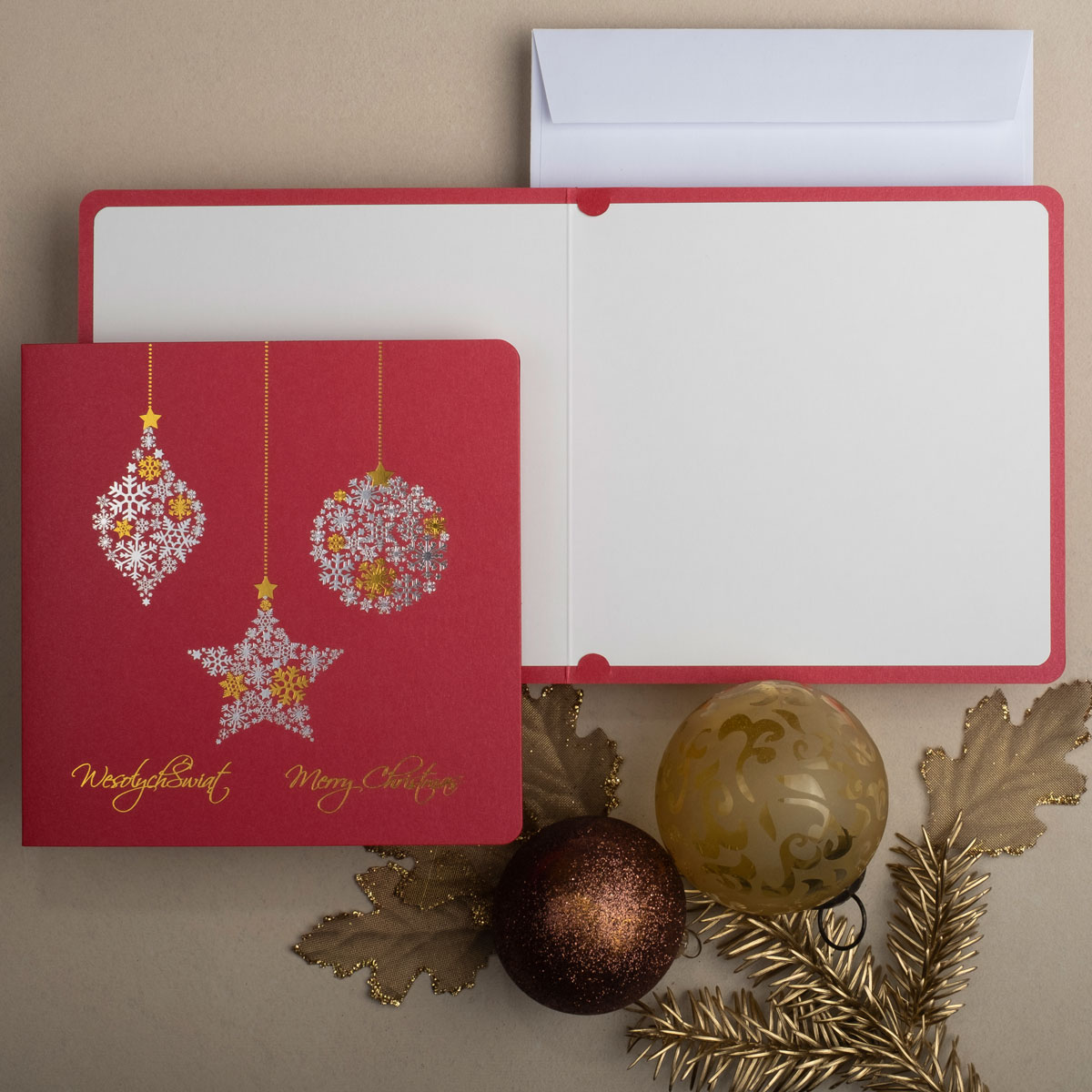 • Papier: Papier: czerwony ozdobny metalizowany 250 g/m² lub czerwony ozdobny matowy 300 g/m². Zdjęcia mogą odbiegać od ostatecznego wyglądu kartki, w zależności od rodzaju użytego papieru