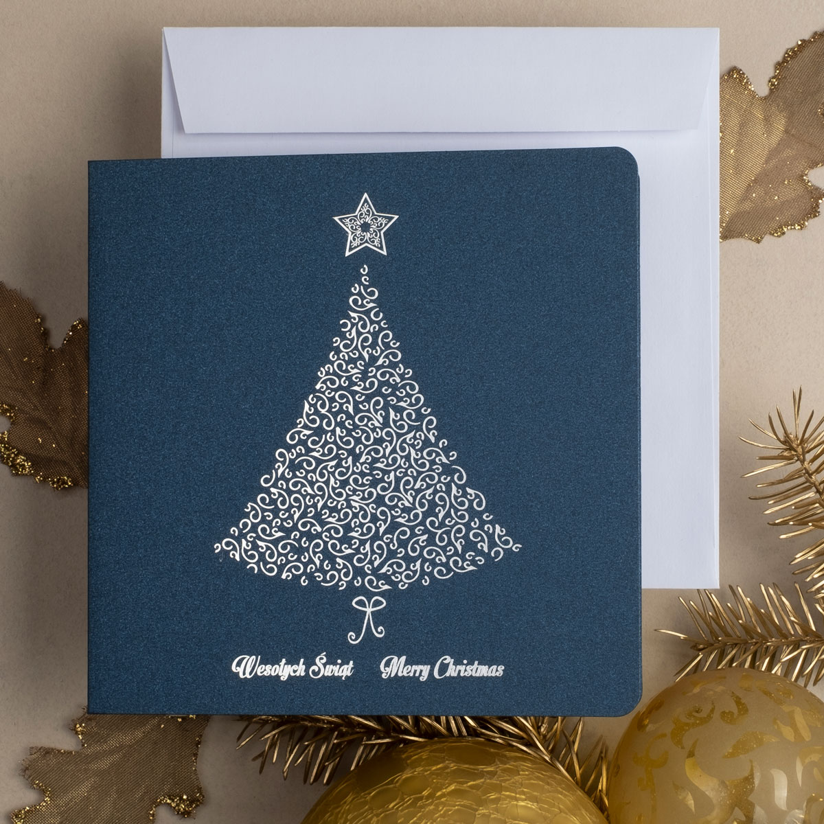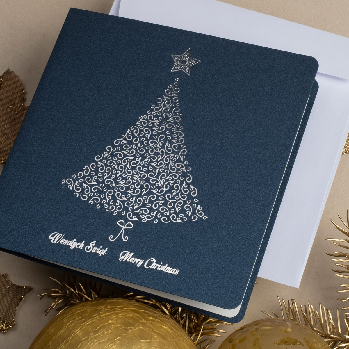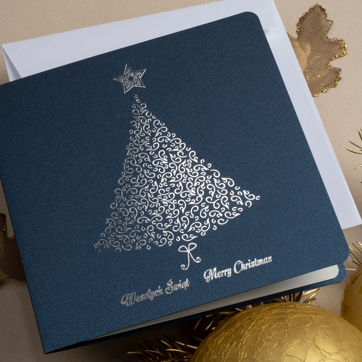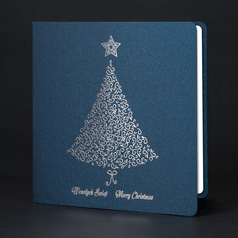 • Papier: granatowy ozdobny metalizowany 230 g/m² lub granatowy ozdobny matowy 300 g/m². Zdjęcia mogą odbiegać od ostatecznego wyglądu kartki, w zależności od rodzaju użytego papieru