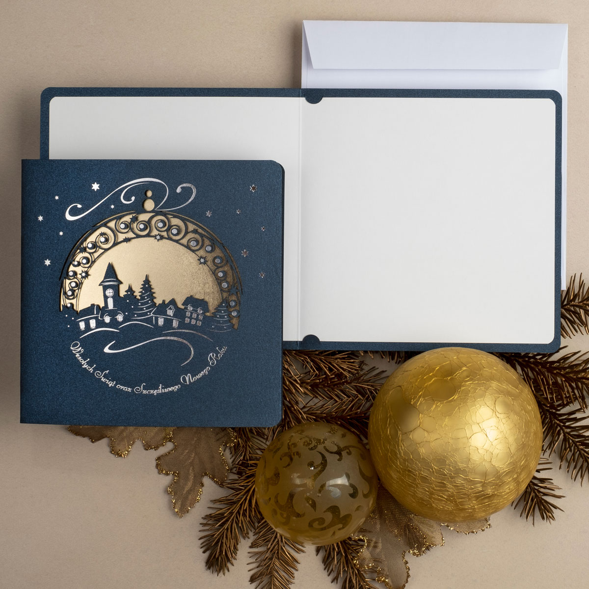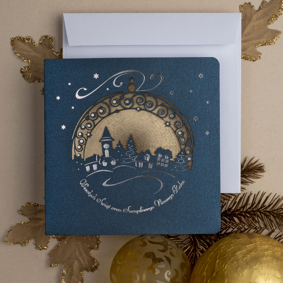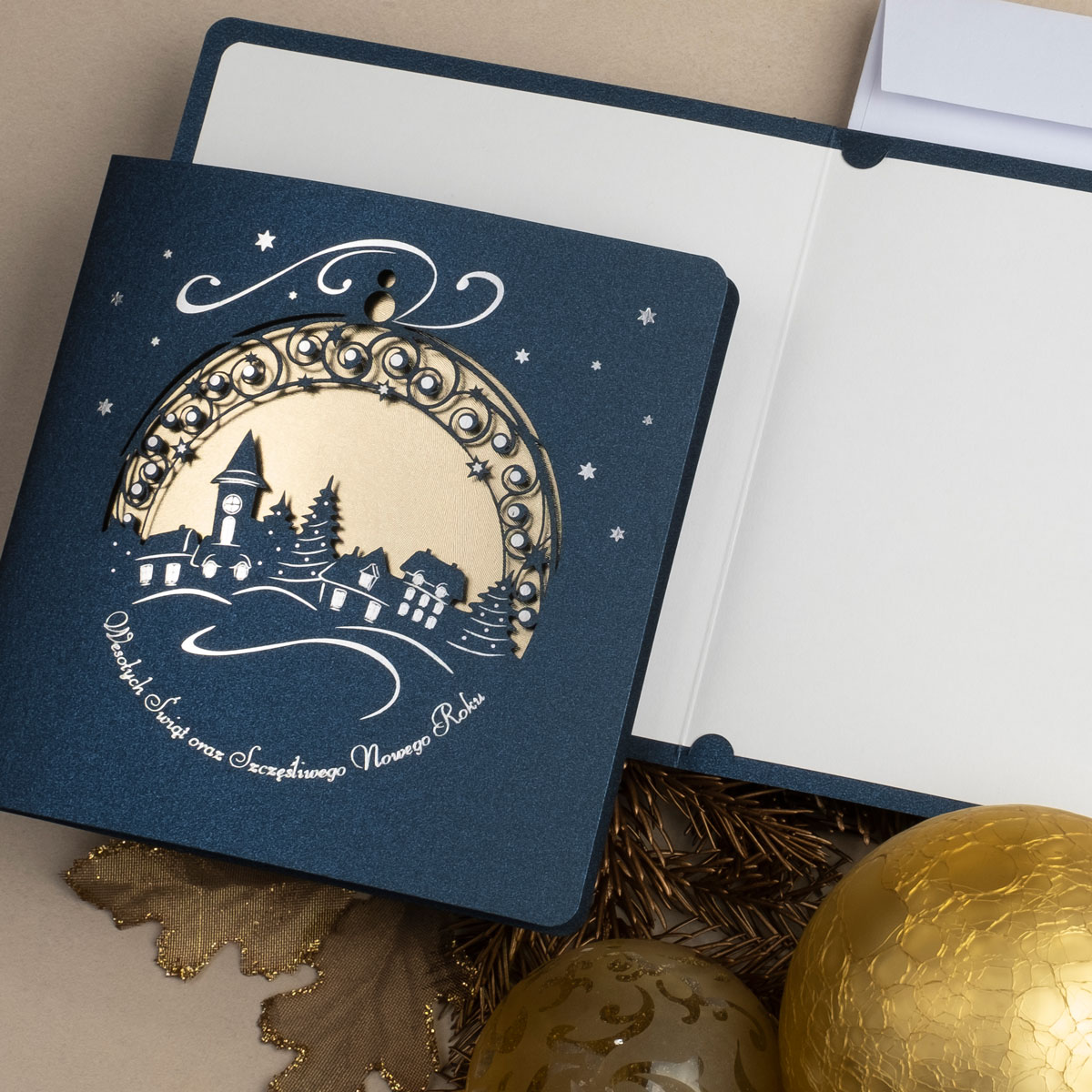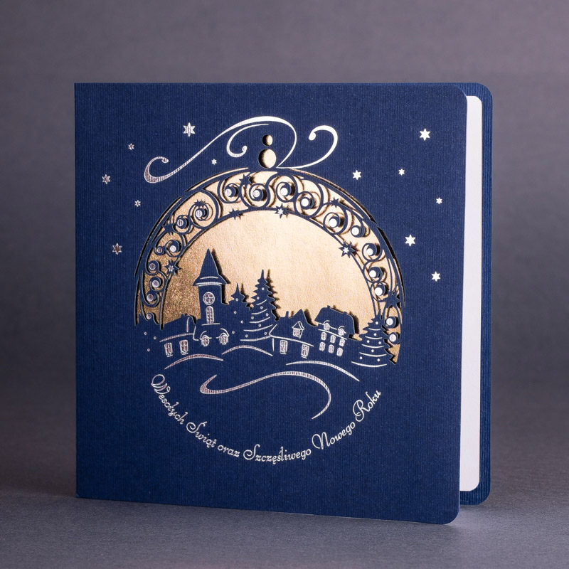 • Papier: granatowy ozdobny metalizowany 230 g/m² lub granatowy ozdobny matowy 300 g/m². Zdjęcia mogą odbiegać od ostatecznego wyglądu kartki, w zależności od rodzaju użytego papieru