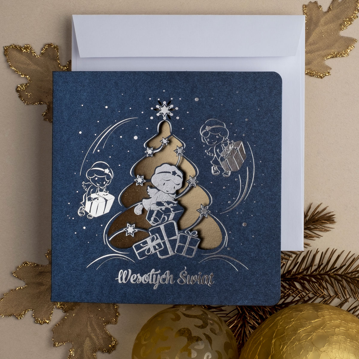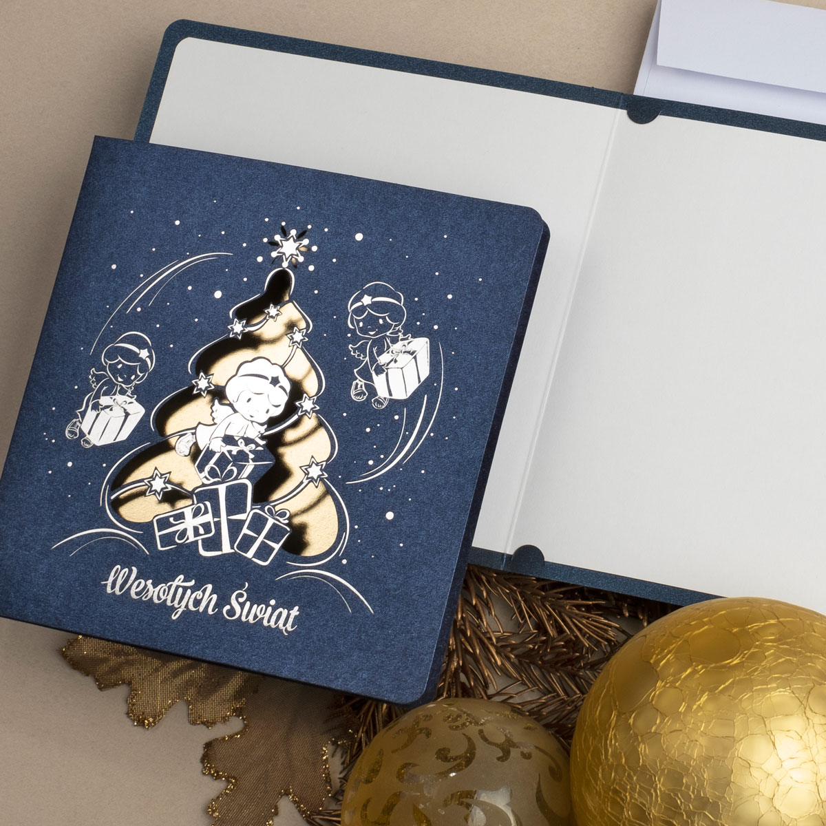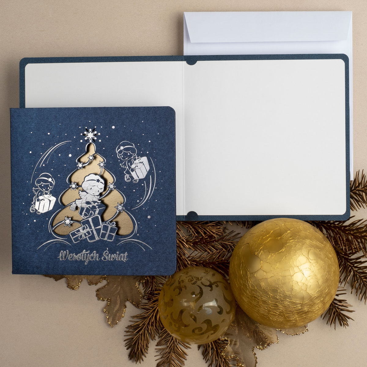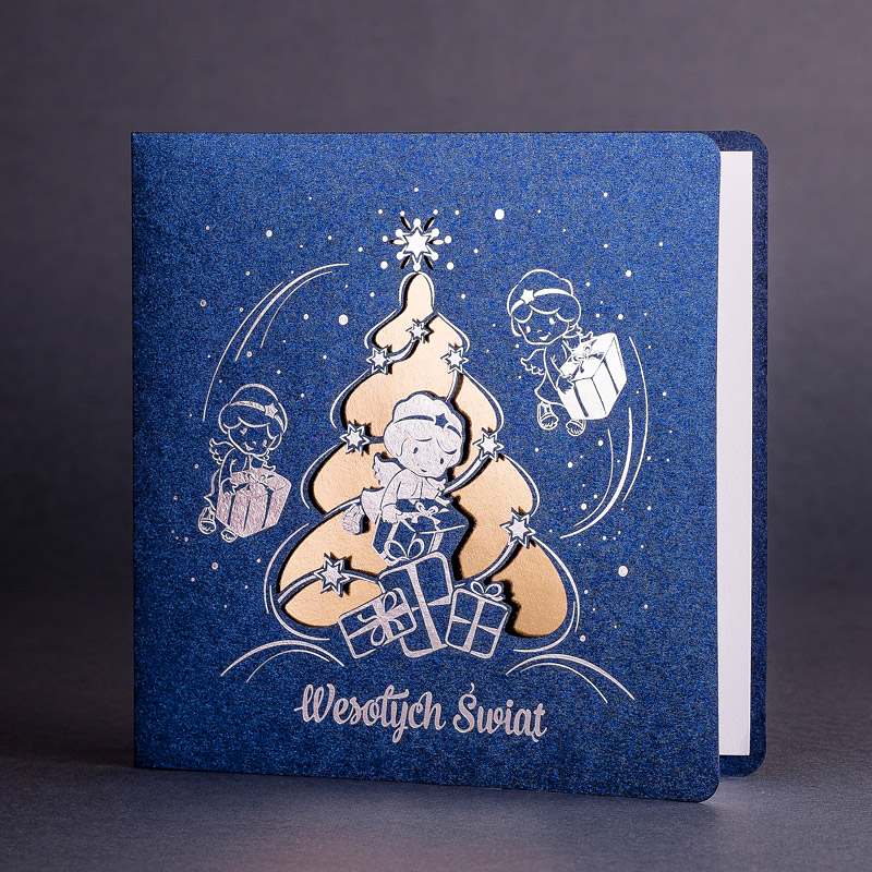 • Papier: granatowy ozdobny metalizowany 230 g/m² lub granatowy ozdobny matowy 300 g/m². Zdjęcia mogą odbiegać od ostatecznego wyglądu kartki, w zależności od rodzaju użytego papieru