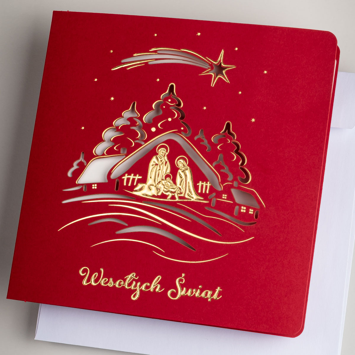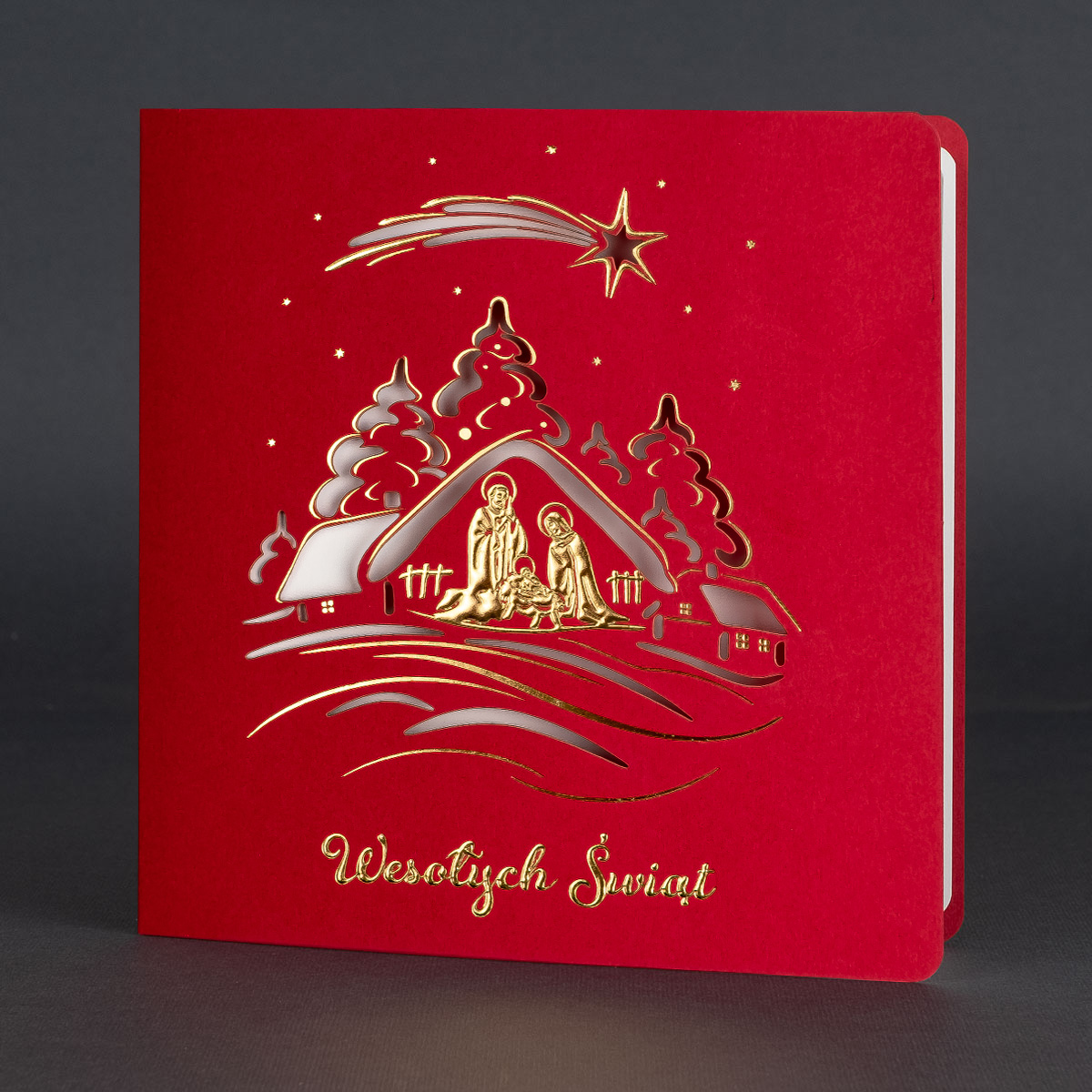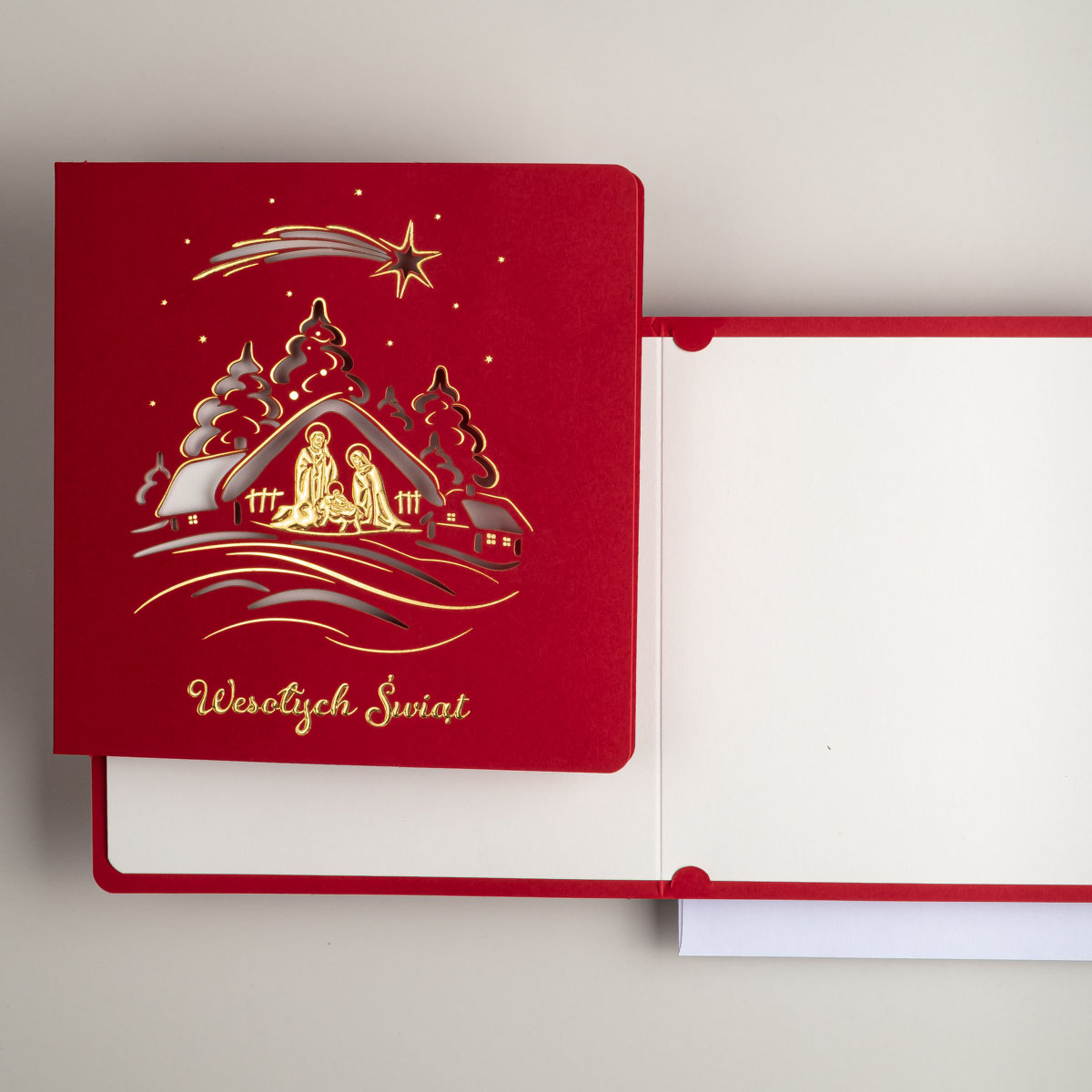 • Nadruk: możliwość zamówienia nadruku cyfrowego życzeń i logo (CMYK 4+0) na wkładce znajdującej się w środku kartki oraz złoconego, tłoczonego lub wycinanego logo na okładce