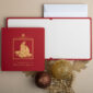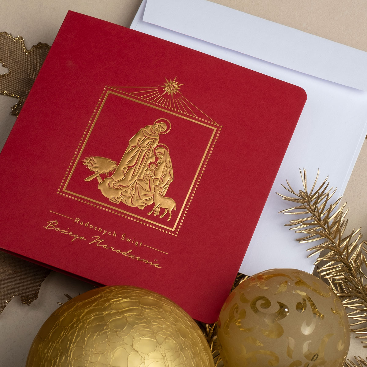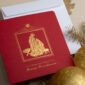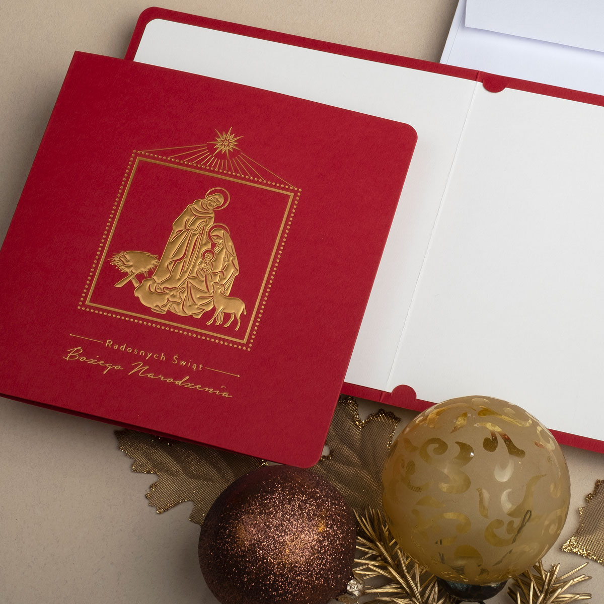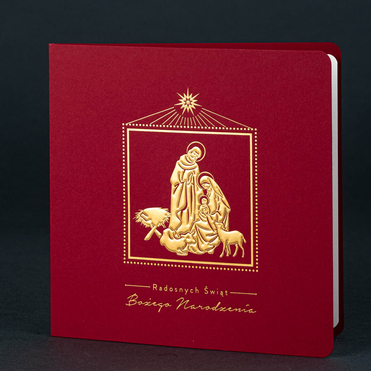 Nadruk: możliwość zamówienia nadruku cyfrowego życzeń i logo (CMYK 4+0) na wkładce znajdującej się w środku kartki oraz złoconego, tłoczonego lub wycinanego logo na okładce