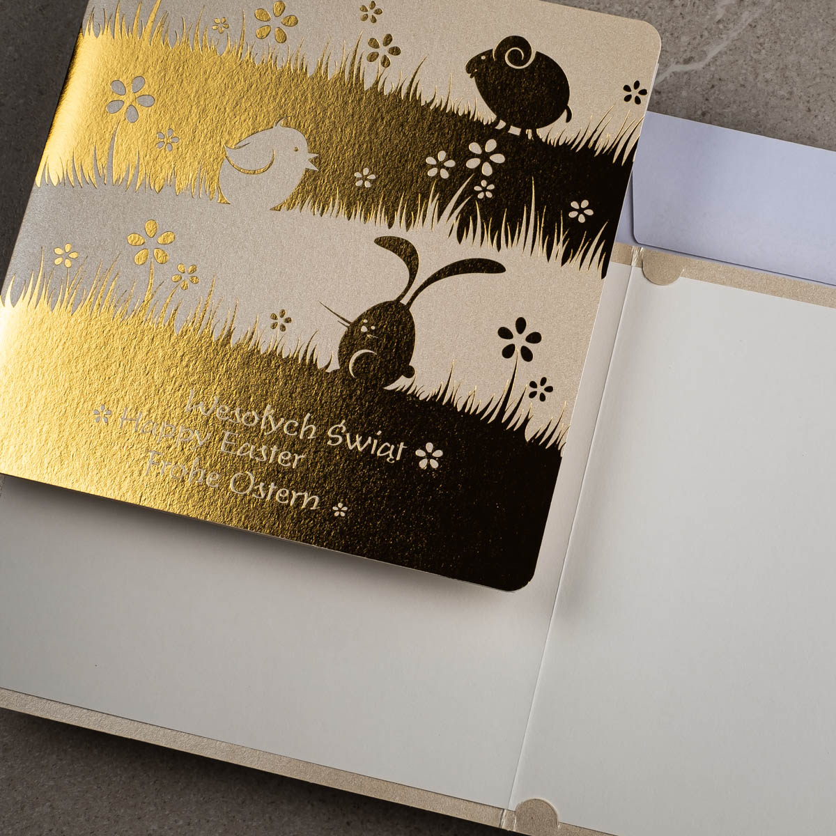 Również kartka świąteczna EE-0202 na Wielkanoc, która widoczna jest na tej stronie umożliwia nadruk logo i życzeń na wkładce w środku kartki. Niestety na zewnątrz wzoru EE-0202 jest zbyt mało miejsca na umieszczenie logotypu na okładce jedną z ww. technik.
