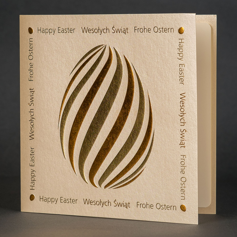 Również kartka świąteczna EE-0203 na Wielkanoc, która widoczna jest na tej stronie umożliwia nadruk logo i życzeń na wkładce oraz umieszczenie logotypu na okładce jedną z ww. technik.