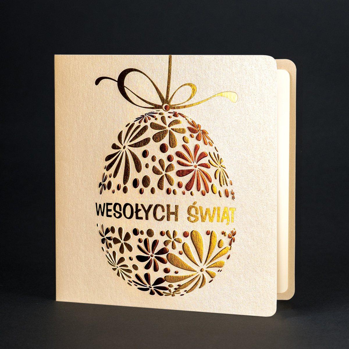 • Nadruk: możliwość zamówienia nadruku cyfrowego życzeń i logo (CMYK 4+0) na kremowej lub białej wkładce o gramaturze 120 g/m² znajdującej się w środku kartki. Możliwy jest również nadruk złoconego, tłoczonego lub wycinanego logo na okładce