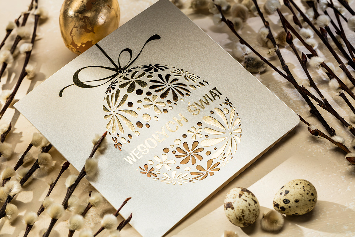 Również kartka świąteczna EE-0206 na Wielkanoc, która widoczna jest na tej stronie umożliwia nadruk logo i życzeń na wkładce oraz umieszczenie logotypu na okładce jedną z ww. technik.