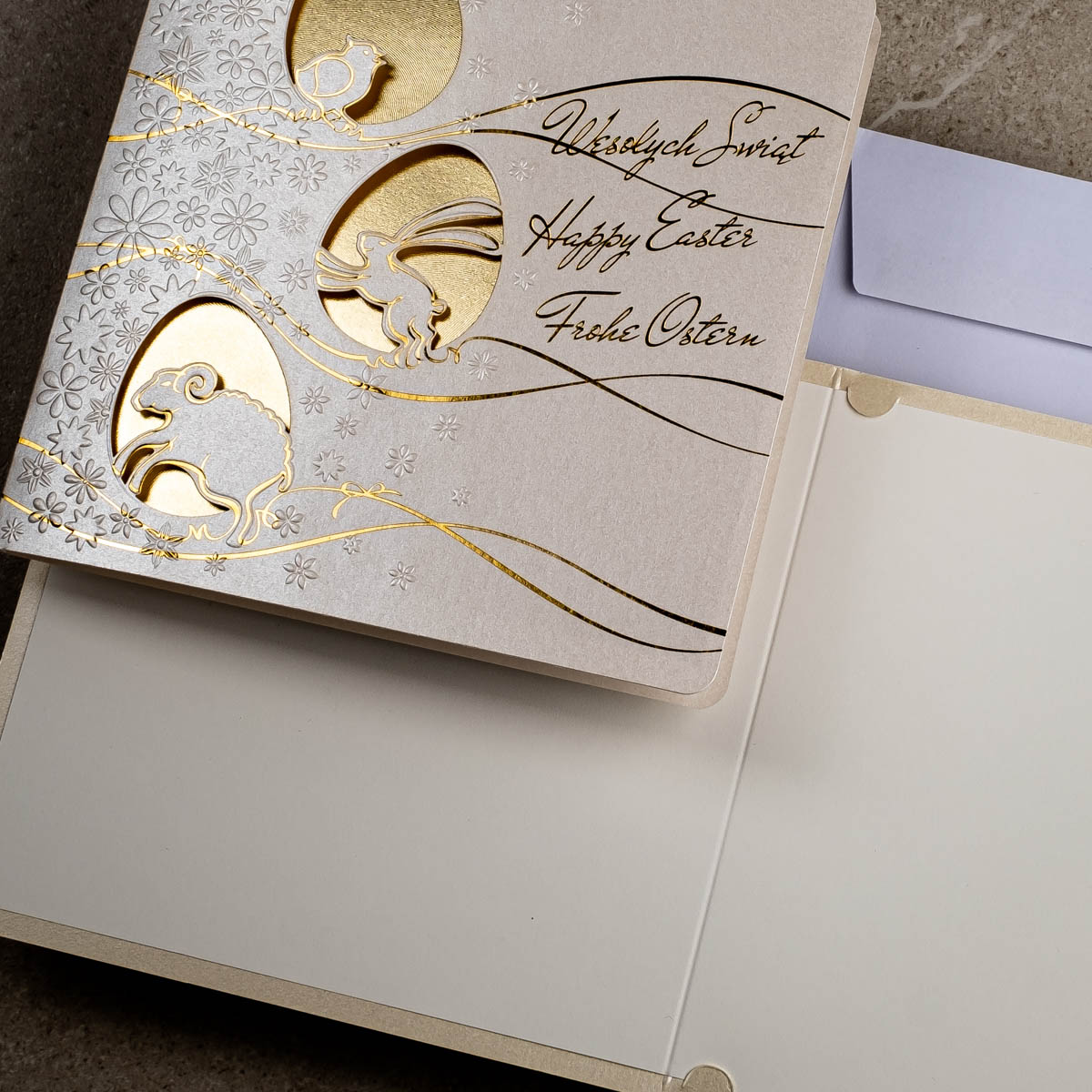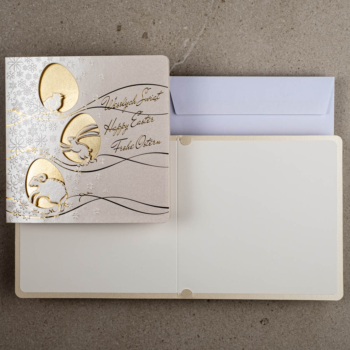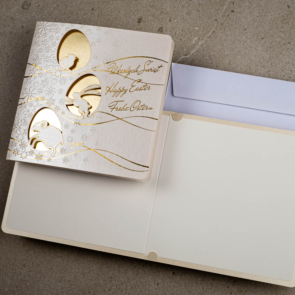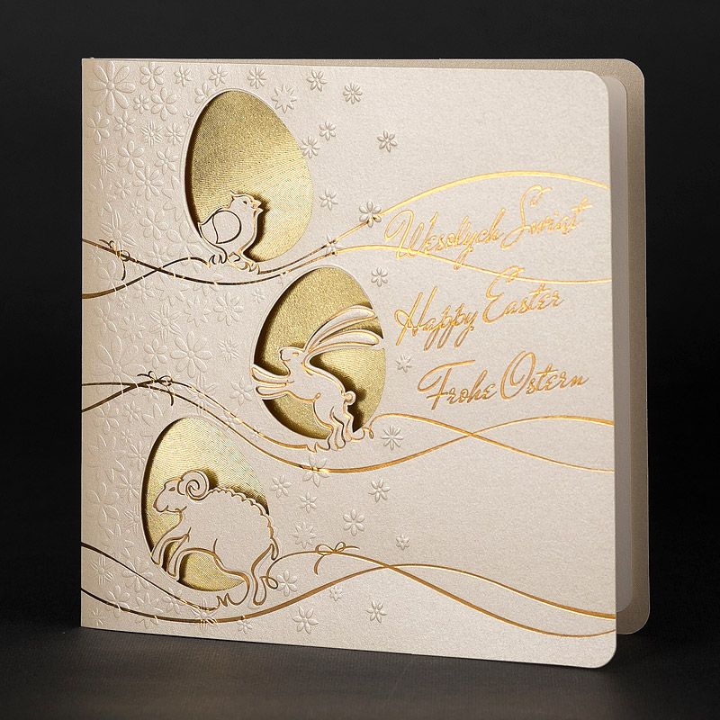 • Koperta: kartki świąteczne wielkanocne posiadają kopertę w kolorze białym z papieru offsetowego 80 g/m². Koperta standardowa jest w cenie kartki.