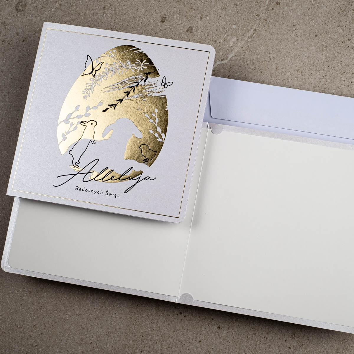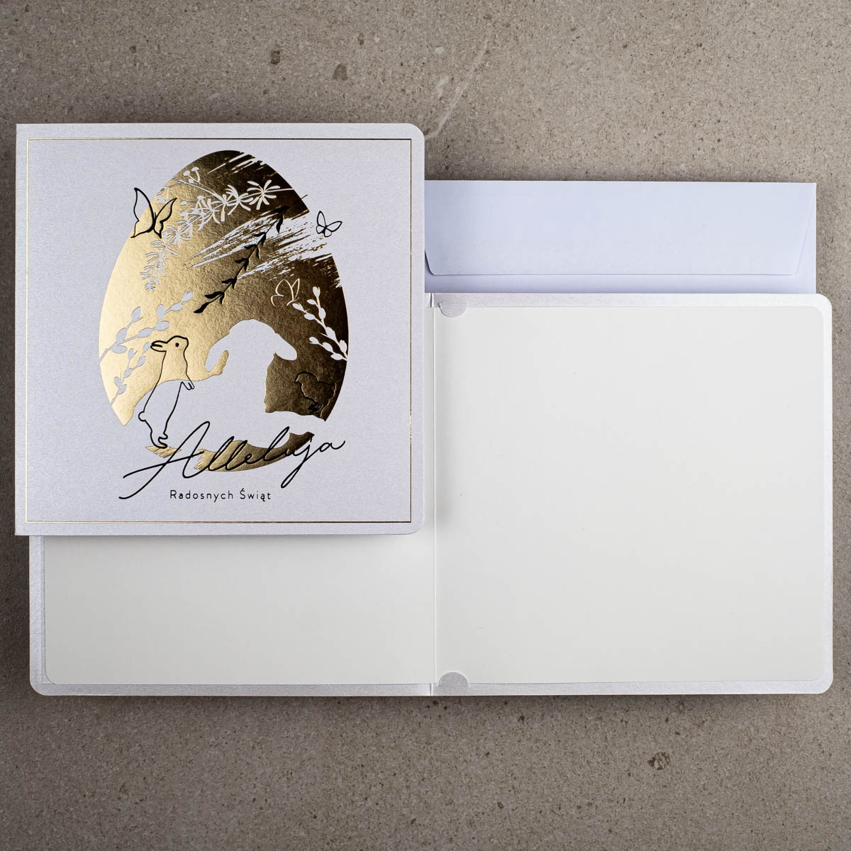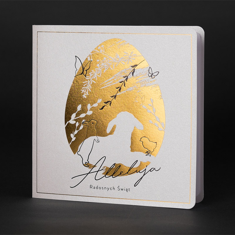 • Koperta: kartki świąteczne wielkanocne posiadają kopertę w kolorze białym z papieru offsetowego 80 g/m². Koperta standardowa jest w cenie kartki.