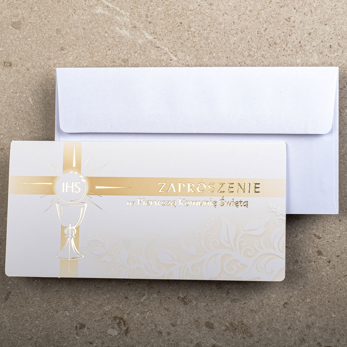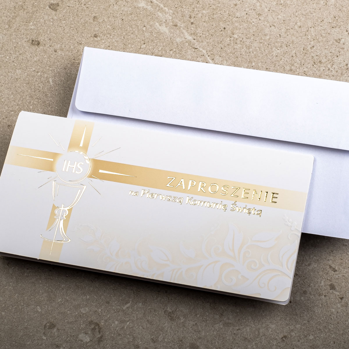 Piękne zaproszenia komunijne ZK-01 do własnoręcznego wypisania. Zaproszenie zostało wykonane techniką druku offsetowego oraz złocenia na papierze kredowym o gramaturze 300g.