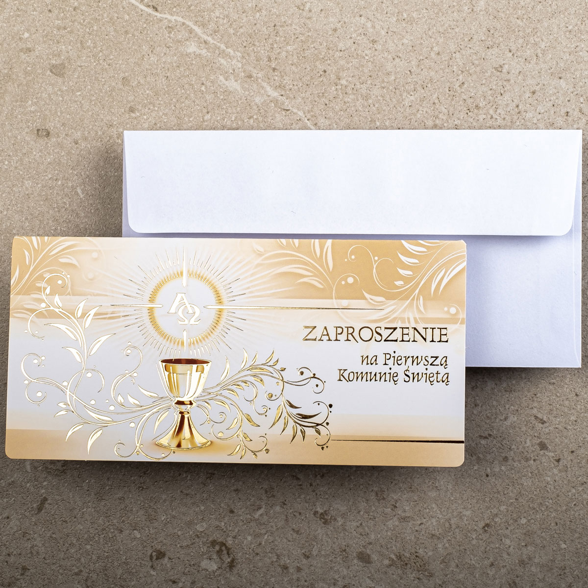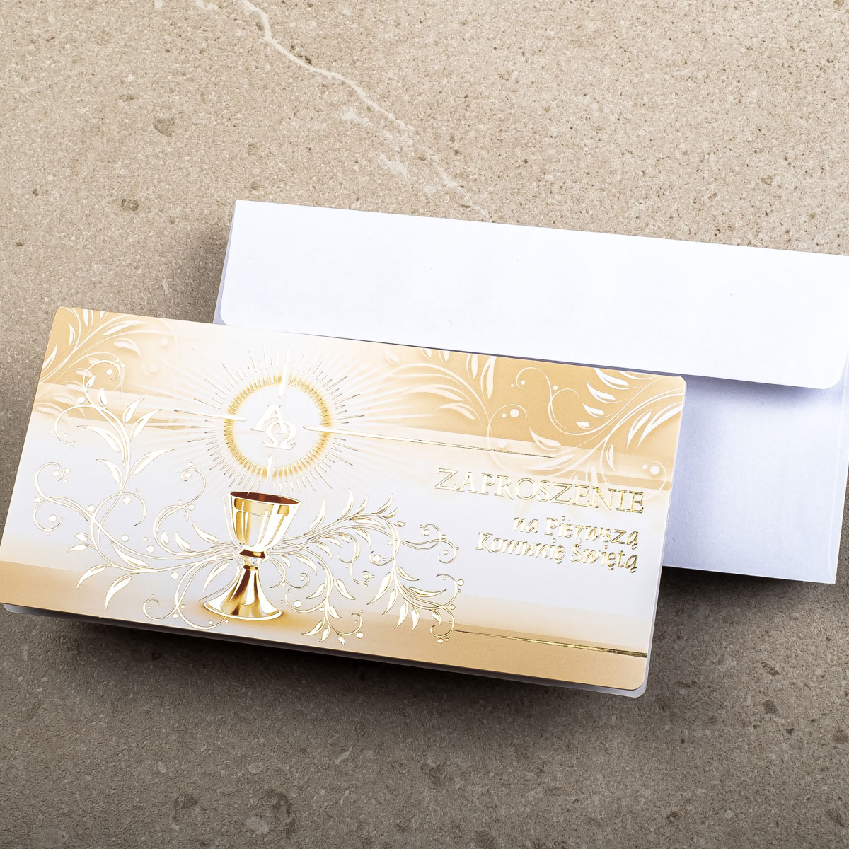 Piękne zaproszenia komunijne ZK-29 do własnoręcznego wypisania. Zaproszenie zostało wykonane techniką druku offsetowego oraz złocenia na papierze kredowym o gramaturze 300g.