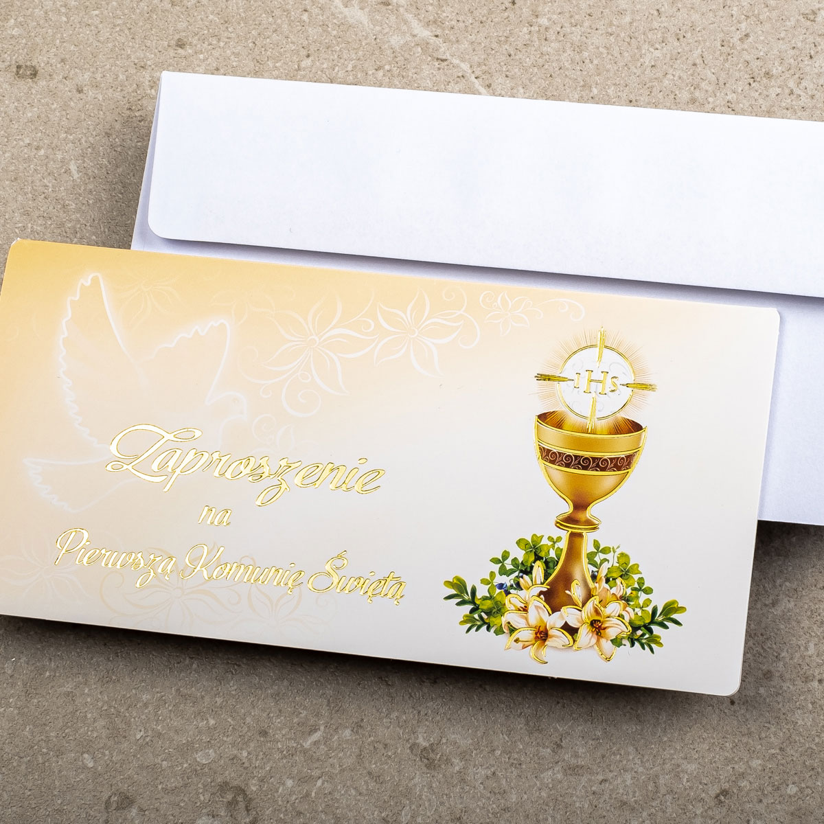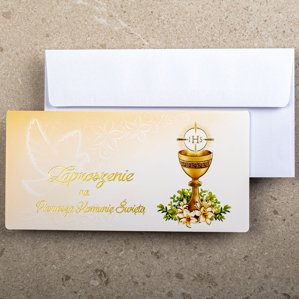 Piękne zaproszenia komunijne ZK-43 do własnoręcznego wypisania. Zaproszenie zostało wykonane techniką druku offsetowego oraz złocenia na papierze kredowym o gramaturze 300g.