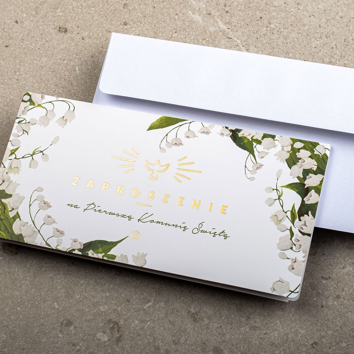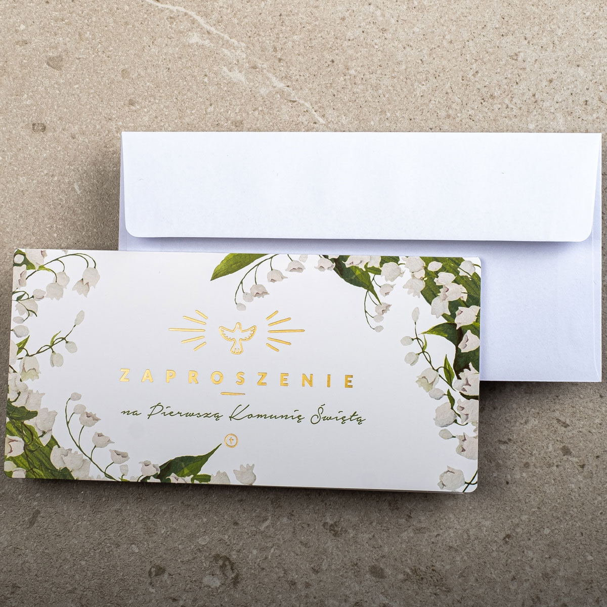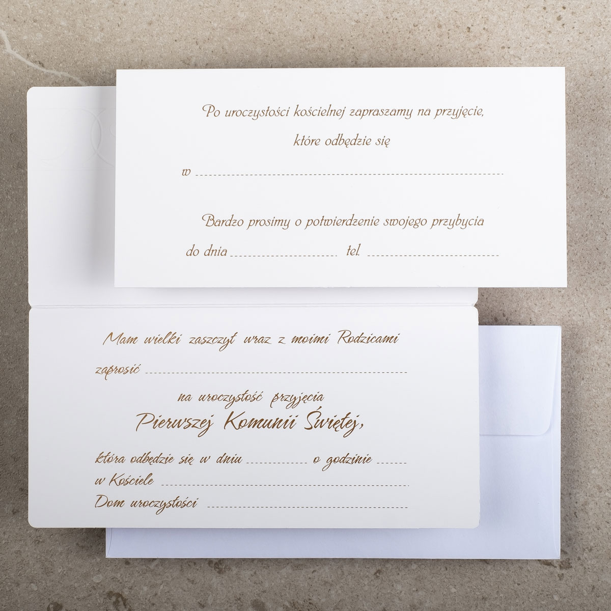 Piękne zaproszenia komunijne ZK-51 do własnoręcznego wypisania. Zaproszenie zostało wykonane techniką druku offsetowego oraz złocenia na papierze kredowym o gramaturze 300g.