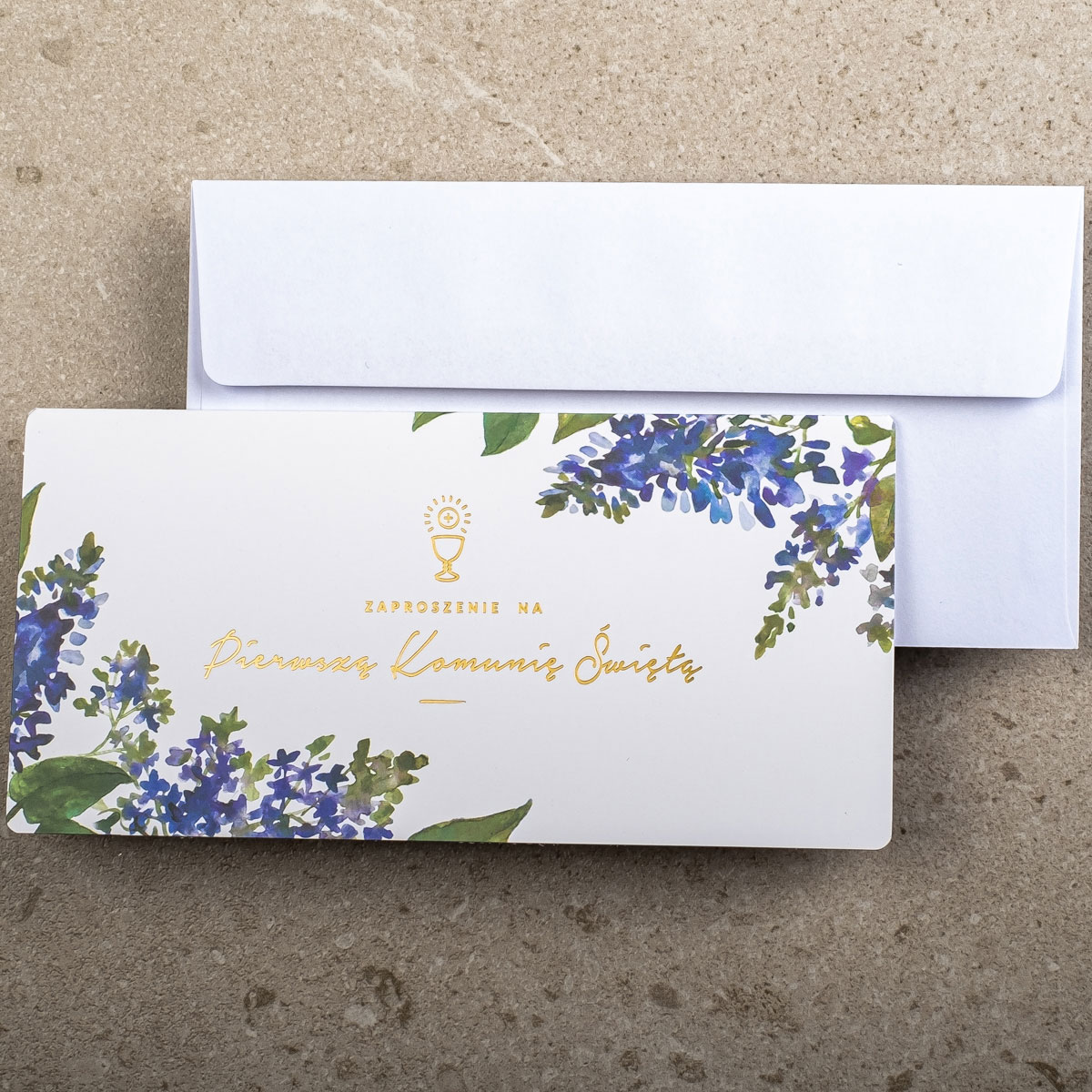 Piękne zaproszenia komunijne ZK-52 do własnoręcznego wypisania. Zaproszenie zostało wykonane techniką druku offsetowego oraz złocenia na papierze kredowym o gramaturze 300g.