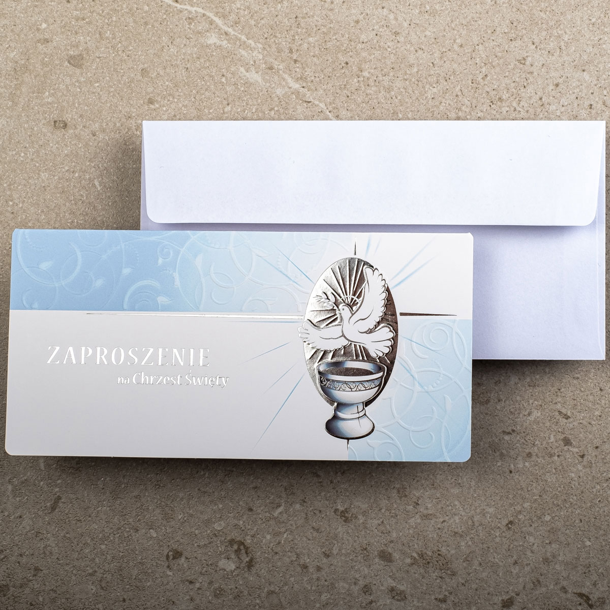 Piękne zaproszenia na Chrzest ZCH-02N do własnoręcznego wypisania. Zaproszenie zostało wykonane techniką druku offsetowego, złocenia oraz tłoczenia, na papierze kredowym o gramaturze 300g.