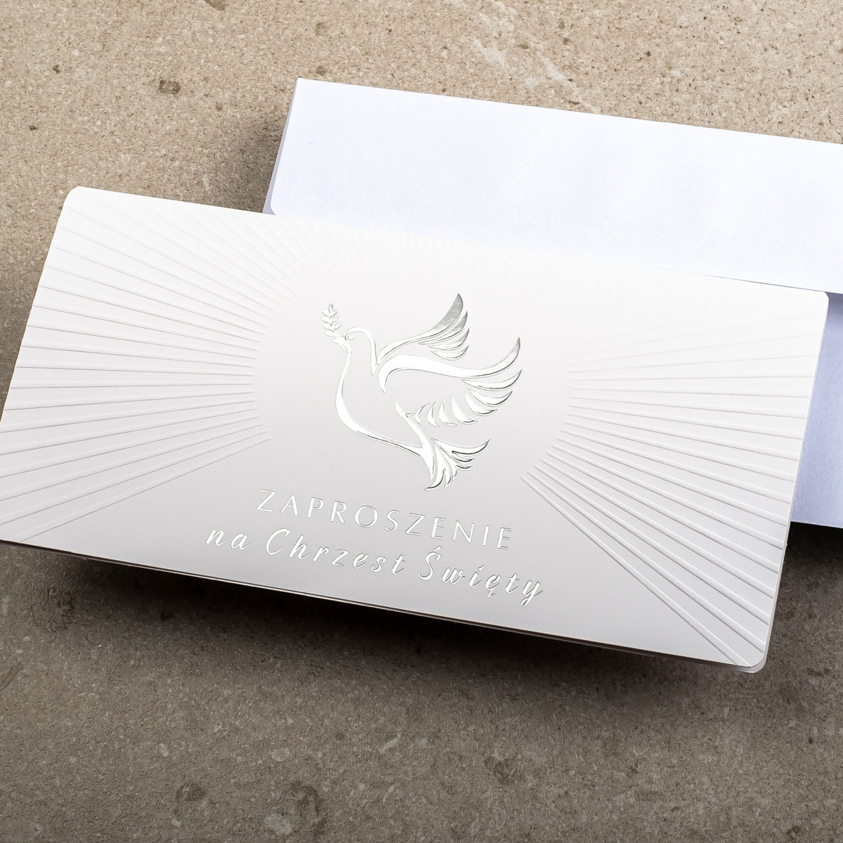 Piękne zaproszenia na Chrzest Święty ZCH-14 do własnoręcznego wypisania. Zaproszenie zostało wykonane techniką druku offsetowego, złocenia oraz tłoczenia, na papierze kredowym o gramaturze 300g.